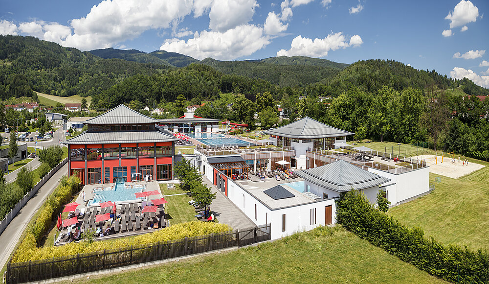 Gäste der Saunalandschaft genießen von den beiden Dachterrassen aus einen wunderschönen Blick auf die gesamte Anlage des Asia Spa Leoben. An der frischen Luft werden Kraft und Energie für die nächsten Saunagänge getankt.